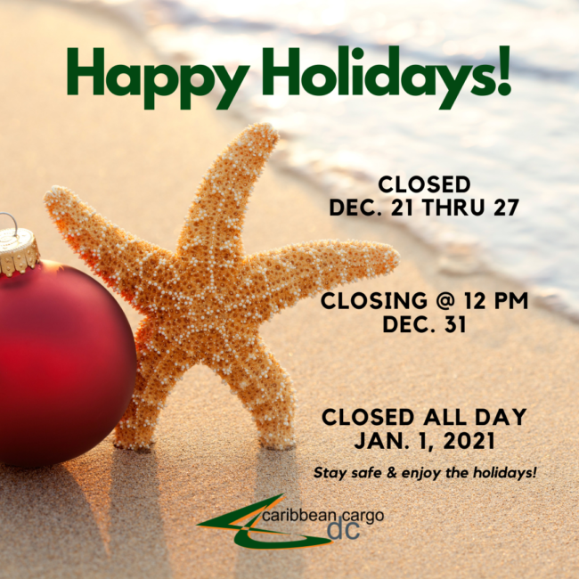 Please make note of our upcoming 2020 Winter Holiday closures below. From all of us here at Caribbean Cargo DC, we wish you a safe and happy holiday season. Thank you for choosing Caribbean Cargo DC!