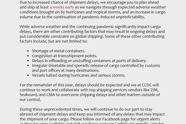 Due to increased chance of shipment delays, we encourage you to plan ahead and ship at least 4 weeks early as we navigate through expected adverse weather conditions brought on by hurricanes and tropical storms, and an increase in cargo volume due to the continuation of pandemic-induced unpredictability. While adverse weather and the continuing pandemic…